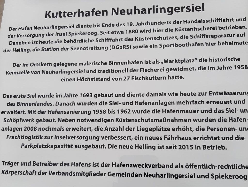 In der letzten Augustwoche verbrachten wir ein paar schöne Tage in Neuharlingersiel an der Nordsee. Der Ort ist seit 1979 Heilbad und der Fährhafen nach Spiekeroog. Unsere Wohnung lag fußläufig nahe zum Strand und zum Ortskern mit dem Kutterhafen. Die Entwicklung des Ortes kann man der folgenden Intotafel entnehmen.